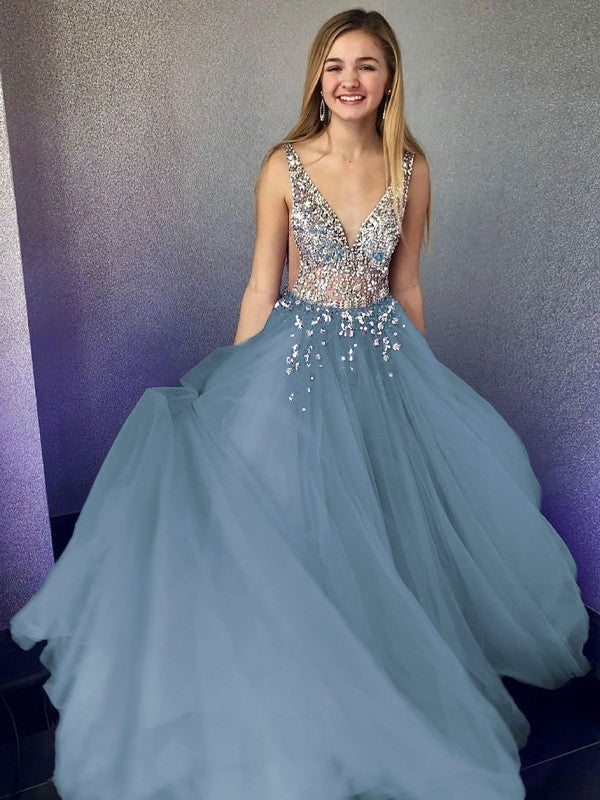 A-Line/Princess Tulle Beading V-neck Sleeveless Floor-Length Prom Dress