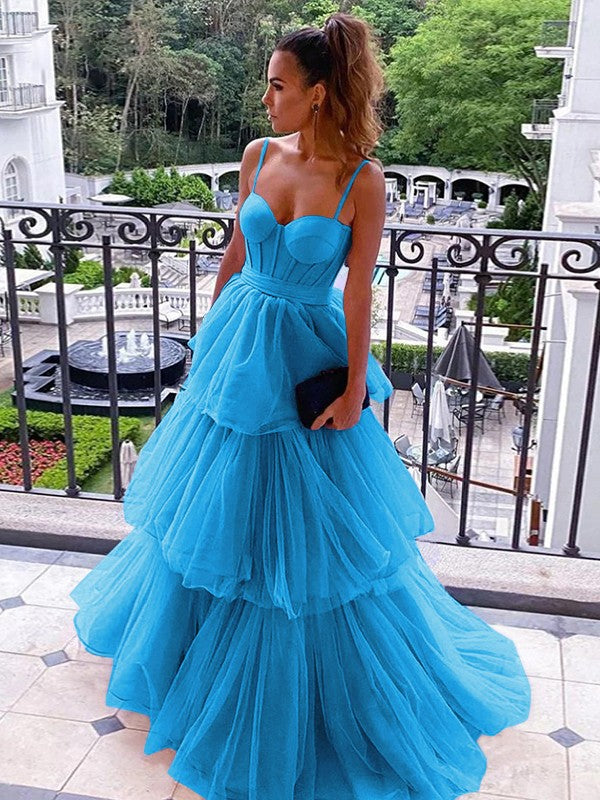 A-Line/Princess Tulle Spaghetti Straps Sleeveless Floor-Length Corset Prom Dress