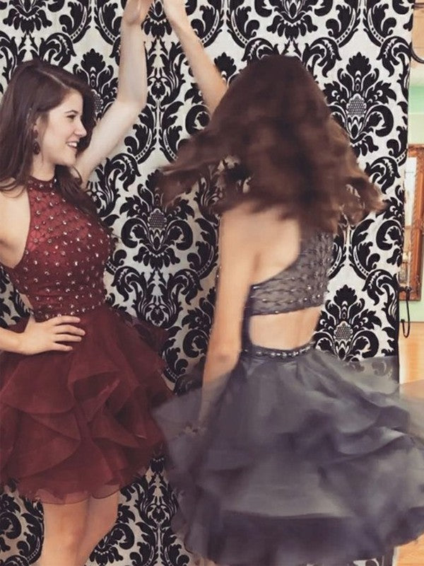 A-Line Tulle High Neck Sleeveless Short/Mini With Beading Homecoming Dress