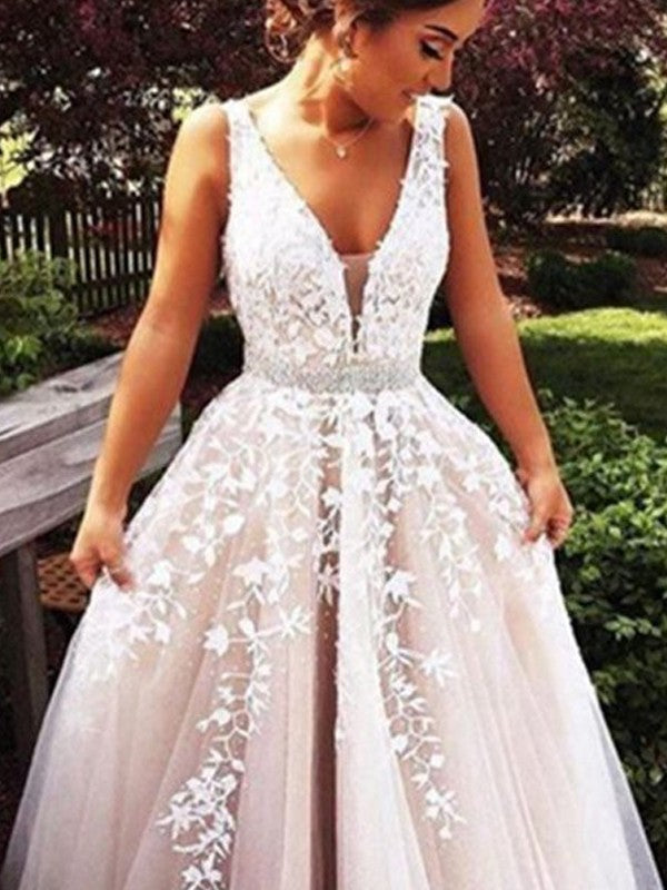A-Line Tulle V-neck Sleeveless Sweep/Brush Train With Applique Prom Dress