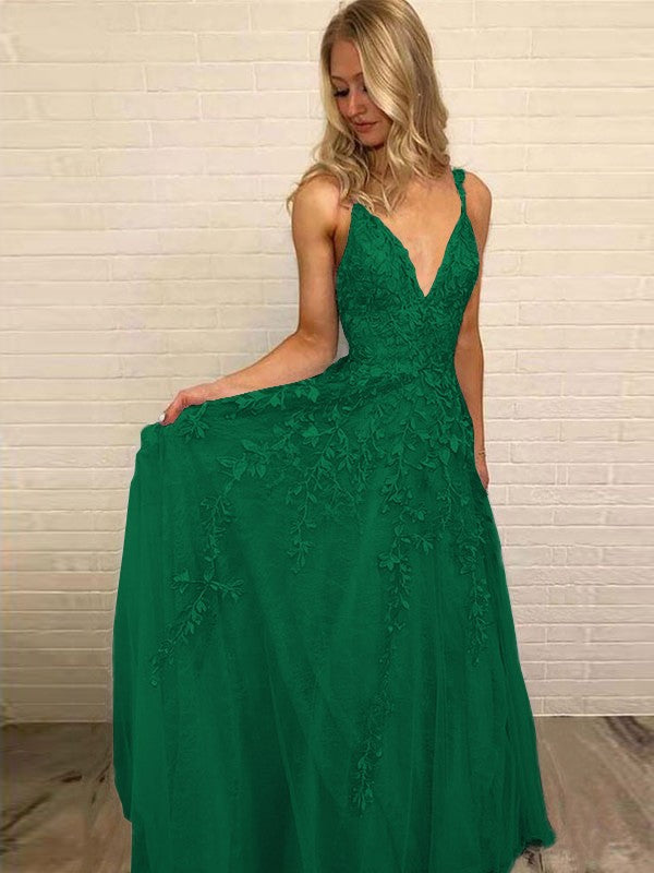 A-Line V-neck Sleeveless Floor-Length With Applique Tulle Prom Dress