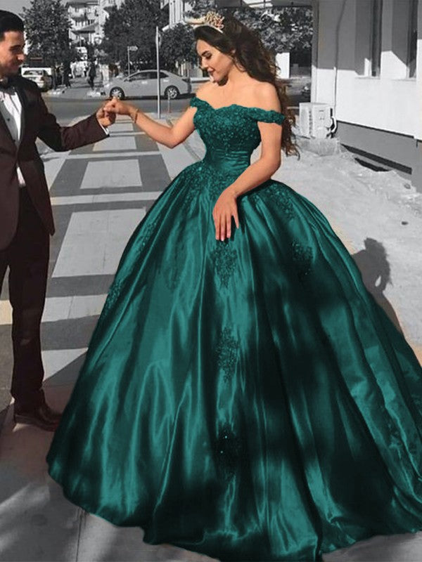 Ball Gown Sleeveless Off-the-Shoulder Sweep/Brush Train Satin Lace Prom Dress