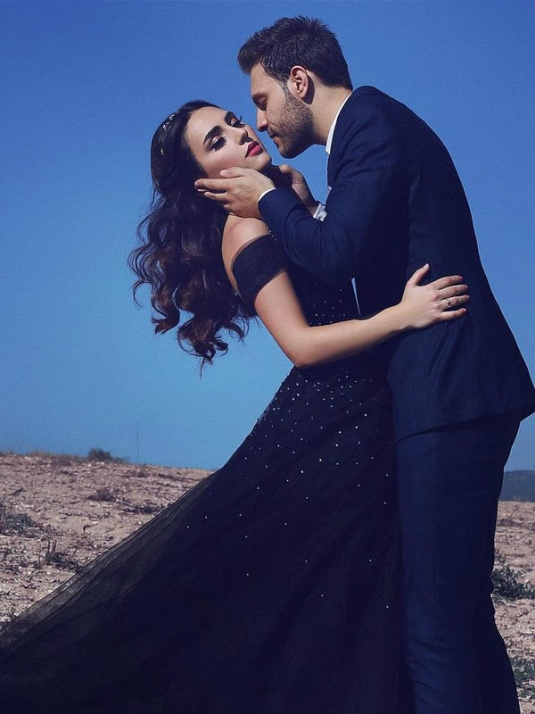 Ball Gown Sleeveless Off-the-Shoulder With Beading Sweep/Brush Train Tulle Prom Dress
