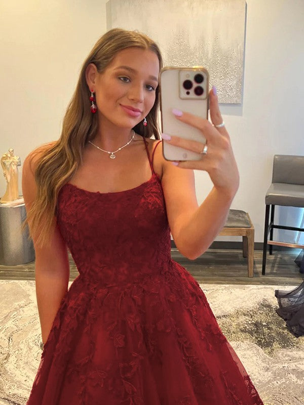Ball Gown Tulle Applique Spaghetti Straps Sleeveless Sweep/Brush Train Corset Prom Dress