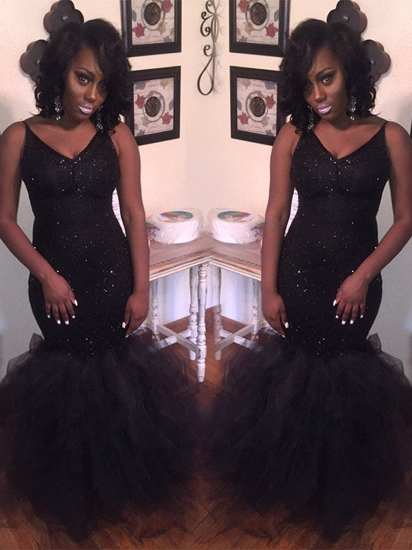 Mermaid Sleeveless V-neck Floor-Length Sequin Tulle Prom Dress