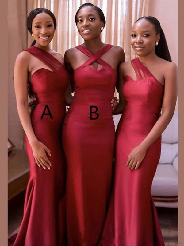Sheath/Column Charmeuse Ruched Halter Sleeveless Sweep/Brush Train Bridesmaid Dresses