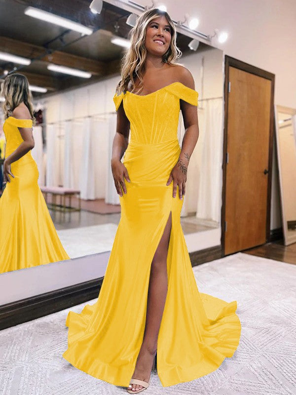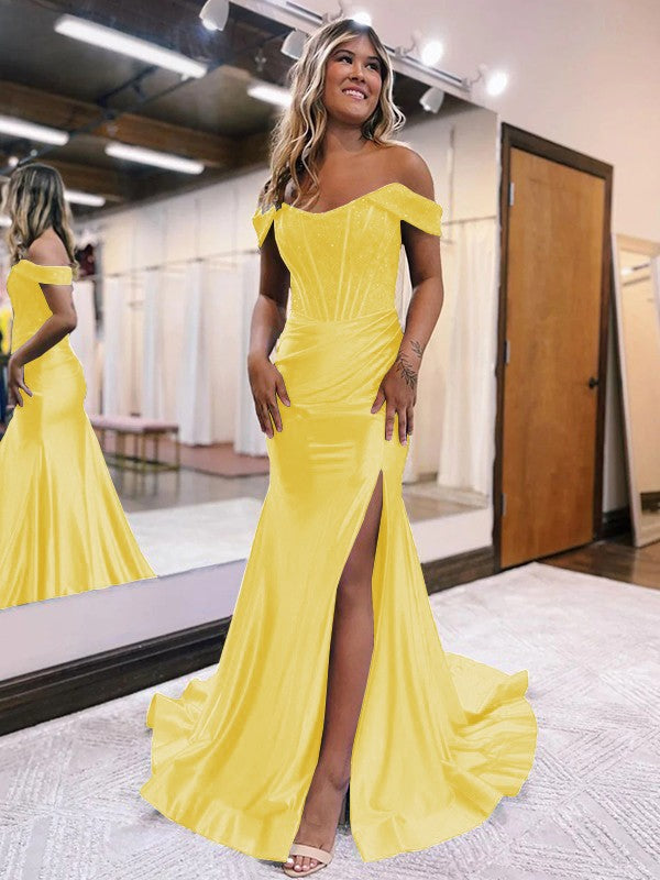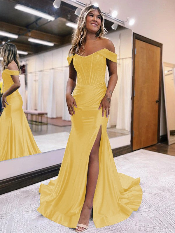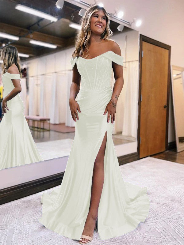Sheath/Column Elastic Woven Satin Ruched Off-the-Shoulder Sleeveless Sweep/Brush Train Corset Prom Dress