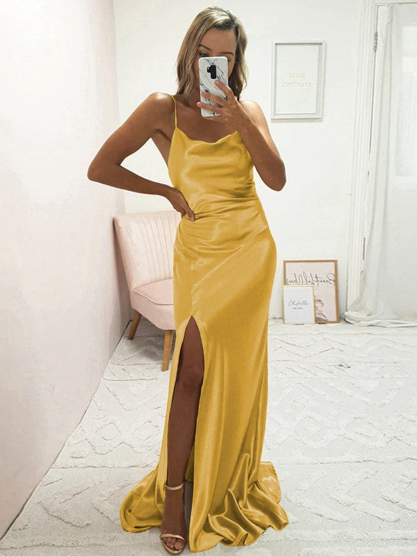 Sheath/Column Elastic Woven Satin Ruched Spaghetti Straps Sleeveless Sweep/Brush Train Bridesmaid Dresses