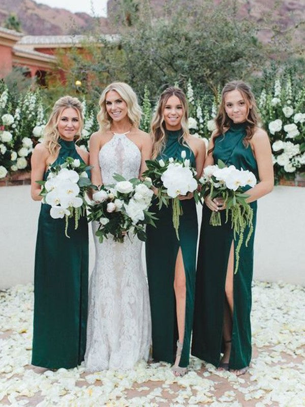 Sheath/Column Halter Satin Ruched Sleeveless Floor-Length Bridesmaid Dresses