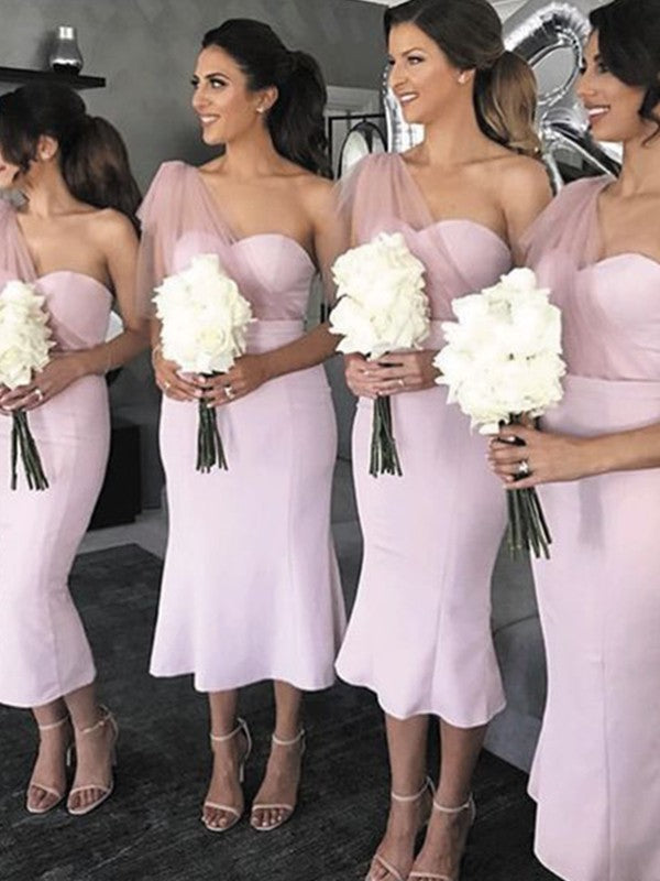 Sheath/Column One-Shoulder Stretch Crepe Ruffles Sleeveless Tea-Length Bridesmaid Dresses