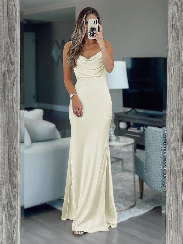 Sheath/Column Silk like Satin Ruched Spaghetti Straps Sleeveless Floor-Length Bridesmaid Dresses