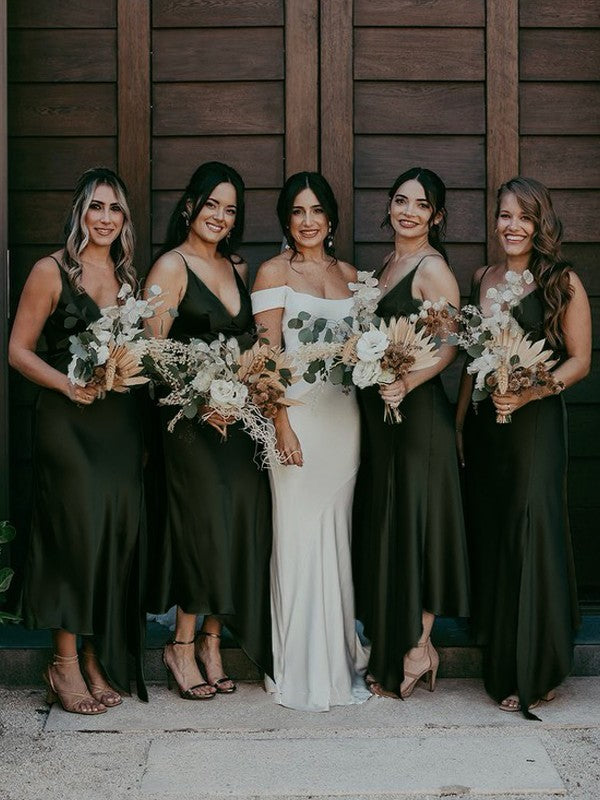 Sheath/Column Silk like Satin Ruched V-neck Sleeveless Floor-Length Bridesmaid Dresses