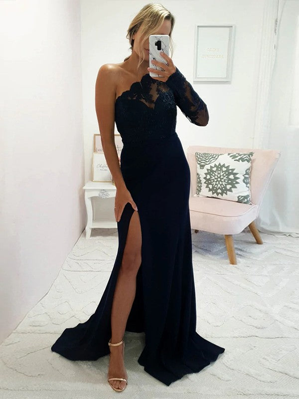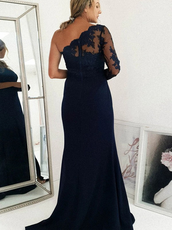 Sheath/Column Stretch Crepe Applique One-Shoulder Long Sleeves Sweep/Brush Train Bridesmaid Dresses