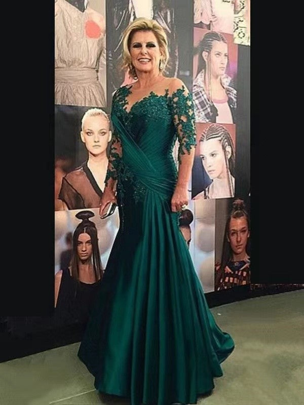Sheath Sheer Neck Long Sleeves With Applique Sweep/Brush Train Elastic Woven Satin Mother of the Bride Dress