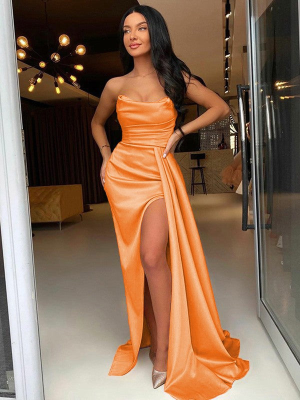 Too Much Fun Sheath Style Elastic Woven Satin Ruched Strapless Sleeveless Sweep/Brush Train Prom Dress