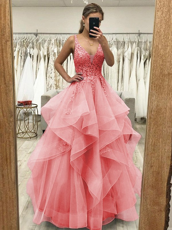Touch of Texture Princess Style Tulle Applique V-neck Sleeveless Floor-Length Corset Prom Dress