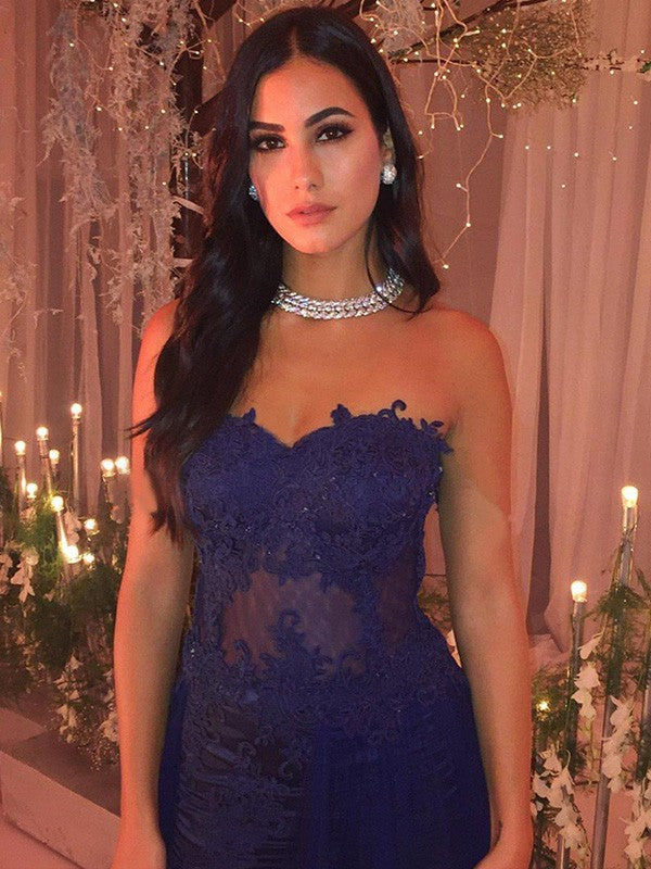 Trumpet/Mermaid Tulle Applique Strapless Sleeveless Sweep/Brush Train Prom Dress